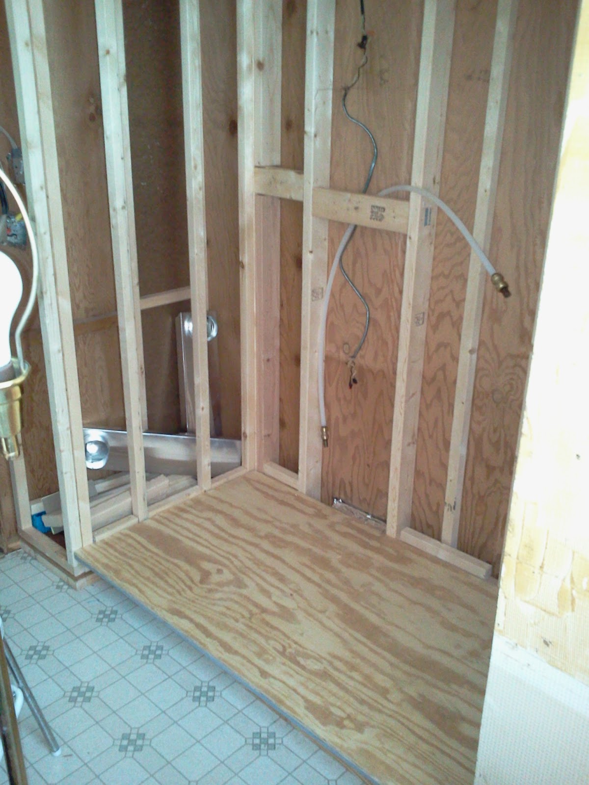 The extra 2x2 is because the wood paneling didn't fit the studs. PPP. Notice the long wall on the left butts up against the plumbing wall. On the other side of the plumbing wall there is a 6" wall that encloses the water heater closet just a bit. I totally messed up on the sequences of building the wall. The plumbing wall should have butted up to the long wall, which should have gone the full length. However, that turned out to be a blessing later, because the water heater was a bit too large to go through the space, and I had to remove that 6" wall! God was watchin' out for me, even in my sloppy planning!